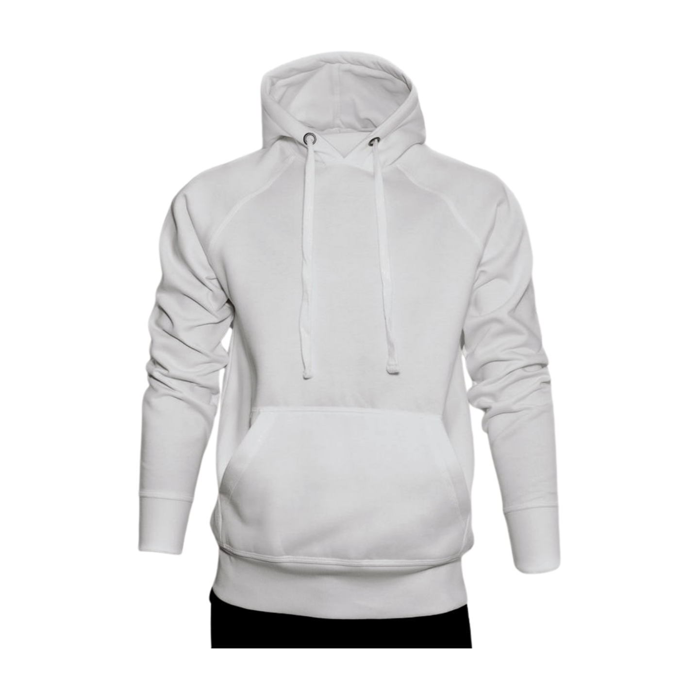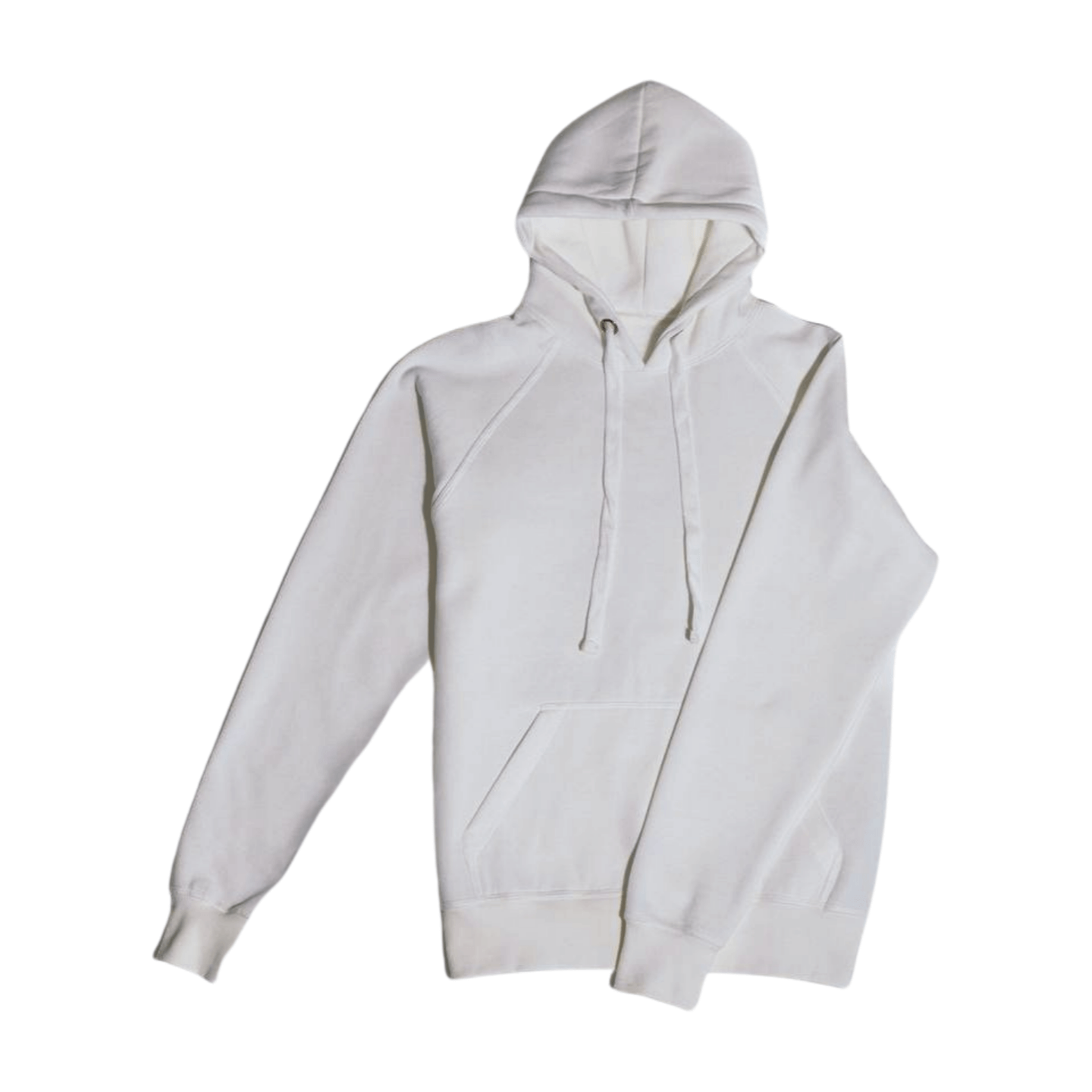 Klassisk hvit hettegenser i bomull med hette og kengurulomme foran, vist mot hvit bakgrunn.